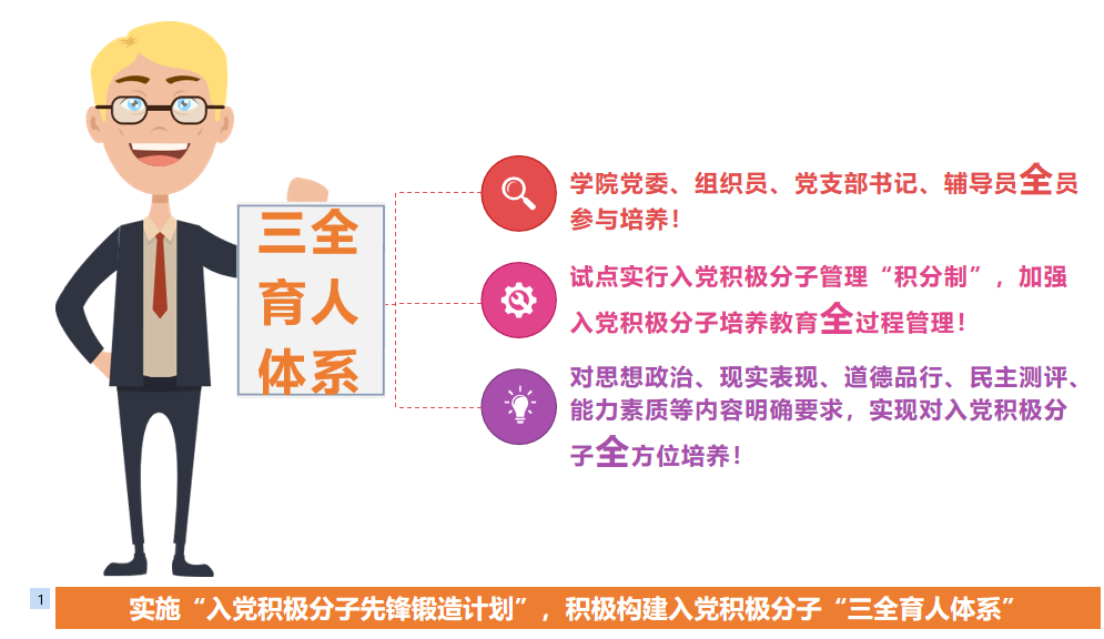 牛彩网 将入党积极分子的教育、培养和管理纳入党建重要内容,积极构建入党积极分子“三全育人体系”。建立健全牛彩网 党委、组织员、党支部书记、辅导员全员参与入党积极分子教育管理的网络,有效解决入党积极分子脱离党组织、疏于管理、难于管理的现象;试点实行入党积极分子管理“积分制”,推行政治素养一票否决制,明确基础达标项,对评奖评优项量化积分,实行清退制度,加强入党积极分子培养教育全过程管理;对思想政治、现实表现、道德品行、民主测评、能力素质等内容明确要求,重视实践教育,实现入党积极分子全方位培养。