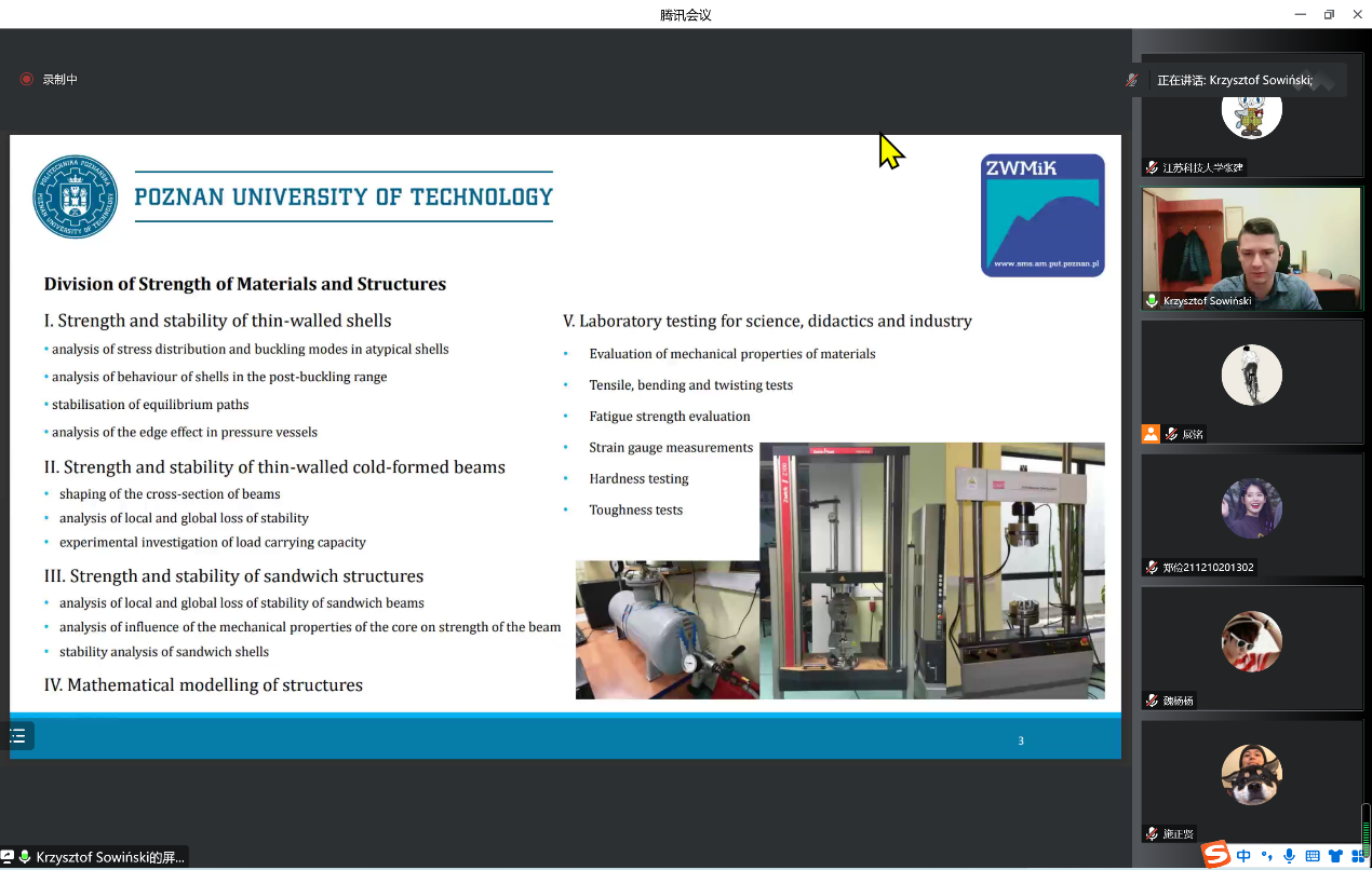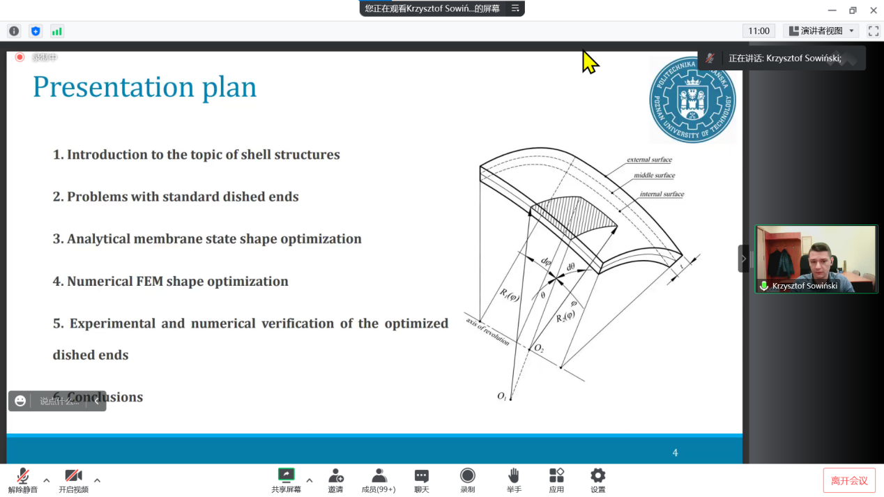2022年12月1日下午3:30,牛彩网 - 牛彩网即时开奖 船海机械大讲堂第3讲如期举行,波兹南理工大学机械工程专业研究员Krzysztof Sowinski博士应邀作了题为“Optimization of dished ends of cylindrical pressure vessels”的线上讲座。本次讲座由牛彩网 副院长张建教授主持,牛彩网 200多名师生参加。