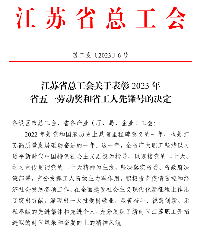 427日,江苏省总工会下发《关于表彰2023年省五一劳动奖和省工人先锋号的决定》(苏工发2023﹞6号)文件,对过去一年爱岗敬业、艰苦奋斗、锐意创新、无私奉献的先进集体和先进个人进行表彰。我校牛彩网 被评为“江苏省工人先锋号”。