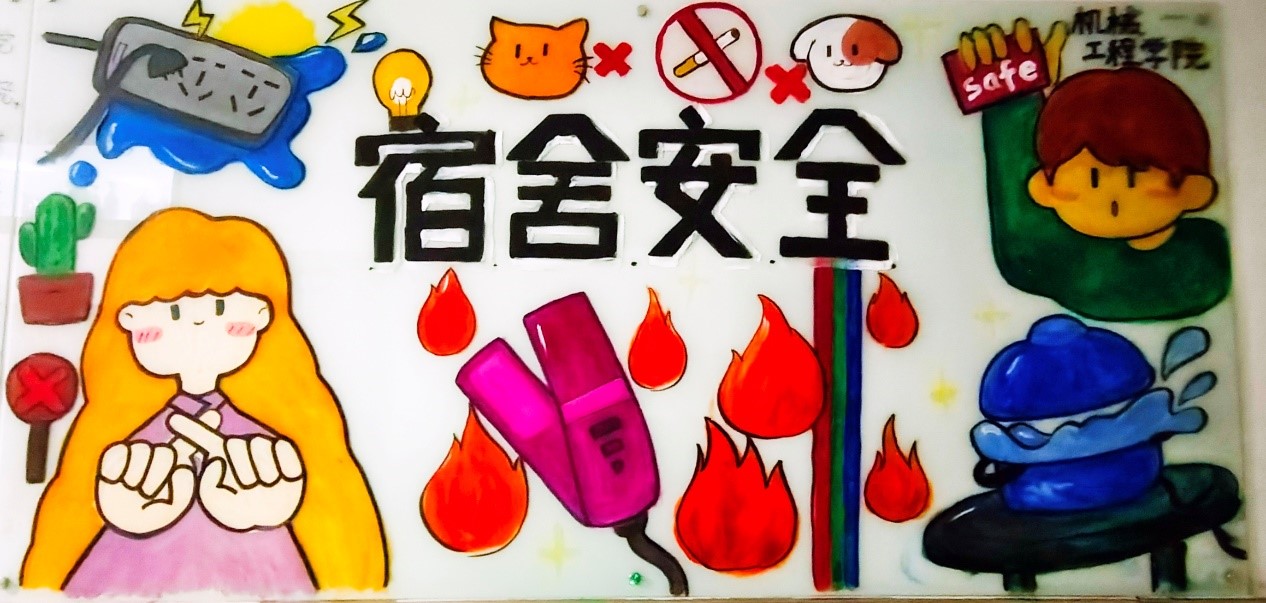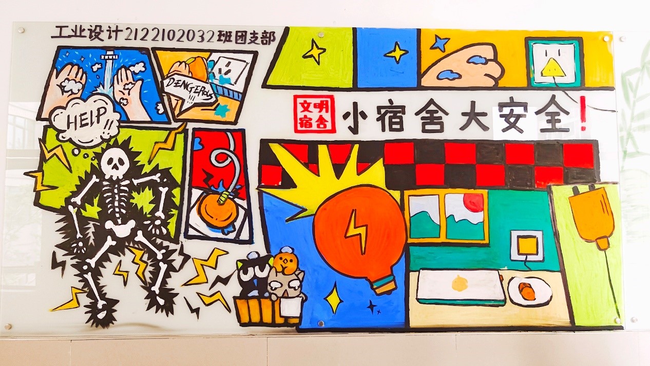21级工业设计的两个班级响应号召,主动和楼管会阿姨沟通交流,确定好绘画材料、绘画主题后,最终在6号组团A、B栋宿舍楼道内画下两幅以“宿舍安全”为主题的板画作品,受到了同学们的一致好评。