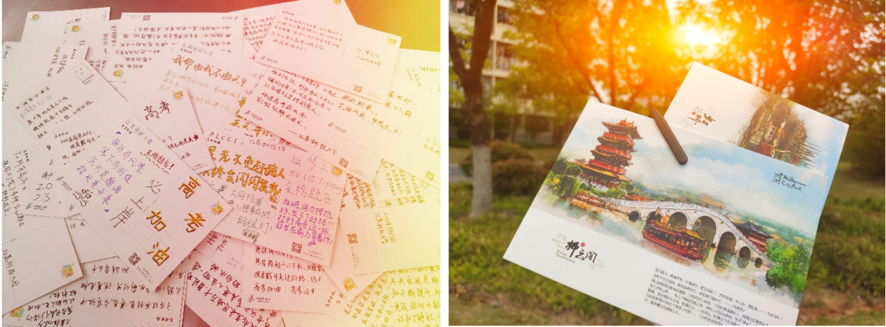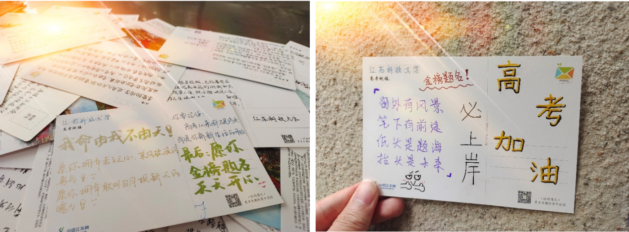十年磨剑放光芒,笔尖生辉多力量,自信满满心莫慌,满腔热血上战场,才思隽永心中藏,知识重点全不忘,长风破浪会有时,金榜题名定辉煌。相信这些话对每一位经历过或者正在经历高考的学子们来说都不会陌生。高考那段时光既是一场战役亦是一段青春。如果说人生是五彩缤纷的,那么青春必是其中最绚丽的一抹;如果说人生是动静交融的,那么青春必是其中最活力四射的一份。来自学长学姐们的祝福写满了整个明信片,仿佛这一刻所有人都回到了自己高考那一年。他们的祝福既是对高三学子的祝福,也是对自己青春的回味,更是对未来自己的激励。