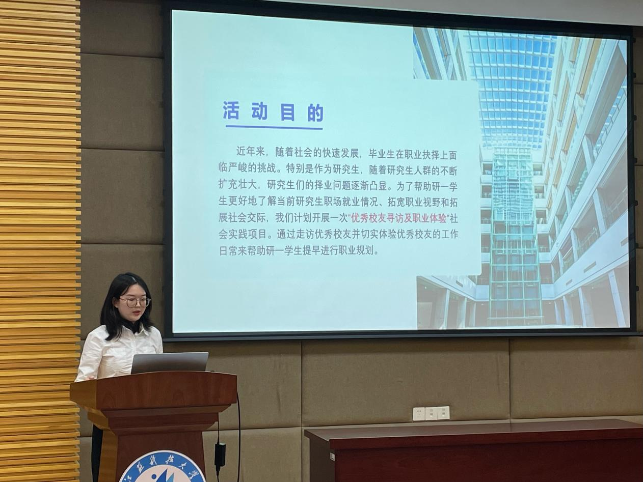 研究生周雯同学正在进行校友寻访实践项目策划答辩
