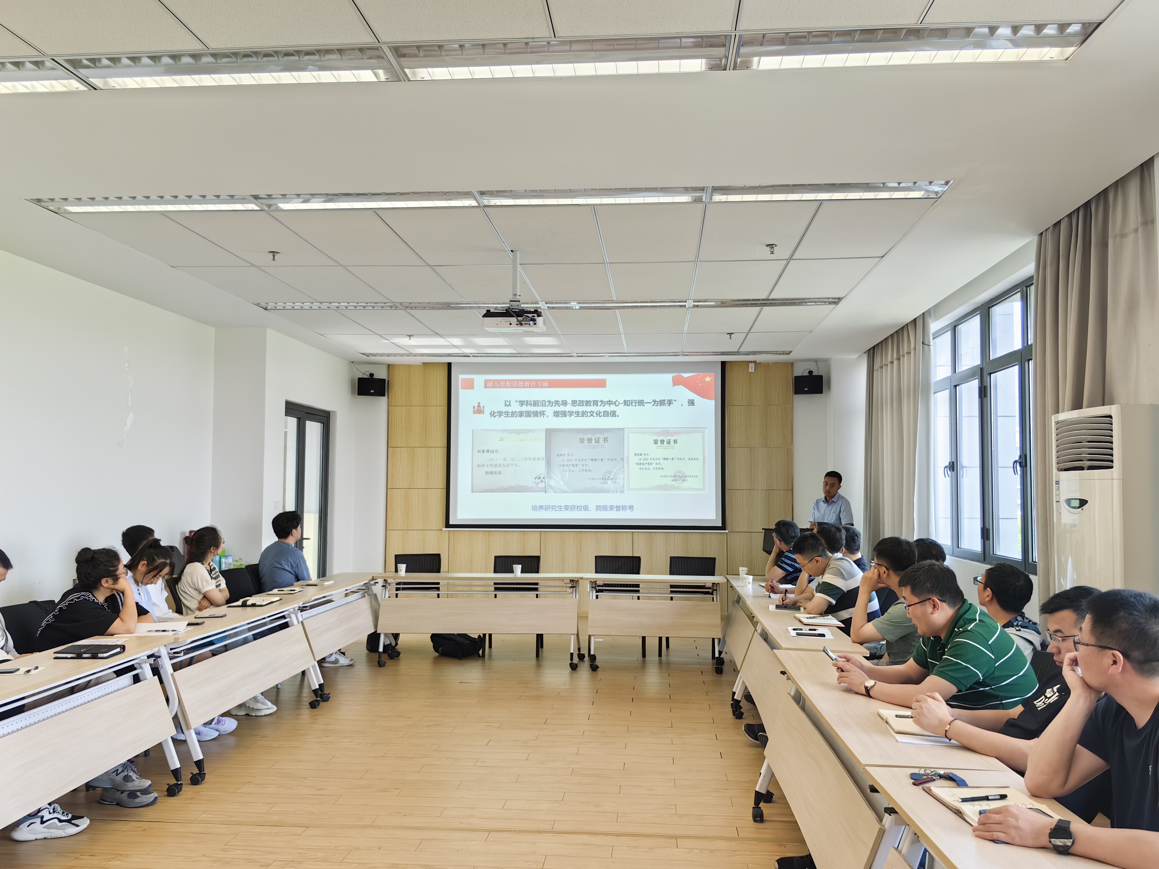 首先,肖贵坚副教授围绕立德树人融入课程与人才培养的方法与成效研究作了主题分享他从党的二十大报告对青年和青年工作的重要论述讲起,强调对青年进行思想引领的重要性,接着,他详细讲解了自己将立德树人融入实践育人、课程教学的人才培养过程的做法和成效,并结合自己讲授的工程制图课程,系统介绍了融入工匠精神的工程制图产教一体化混合教学模式,分享了自己对本科生、硕士生、博士生、博士后培养的体会。