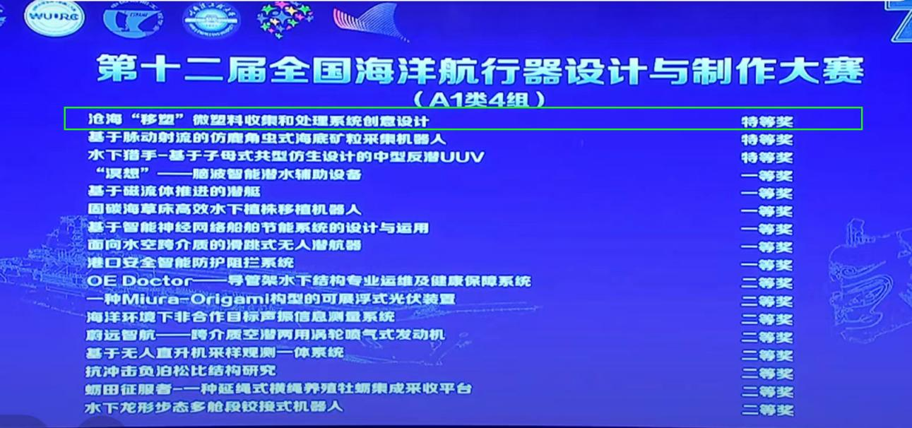 8月12日-13日,第十二届全国海洋航行器设计与制作大赛暨第二届世界大学生水下机器人大赛(简称海航赛)在哈尔滨工程大学举办。牛彩网 “沧海一粟队”团队创作的“沧海‘移塑’——微塑料收集和处理系统创意设计”获A1类新概念创意设计赛道全国特等奖;“守护珊瑚海”团队的”珊瑚卫士——珊瑚礁智能化修复辅助设备创新设计”获得B2类设计与制作水下组赛道全国二等奖(指导老师:刘李明),“养机专业户”团队的“跨介质三维度海上协同无人巡查系统”团队荣获A1新概念创意设计全国二等奖(指导老师:王佳)。