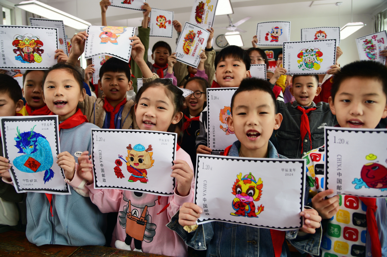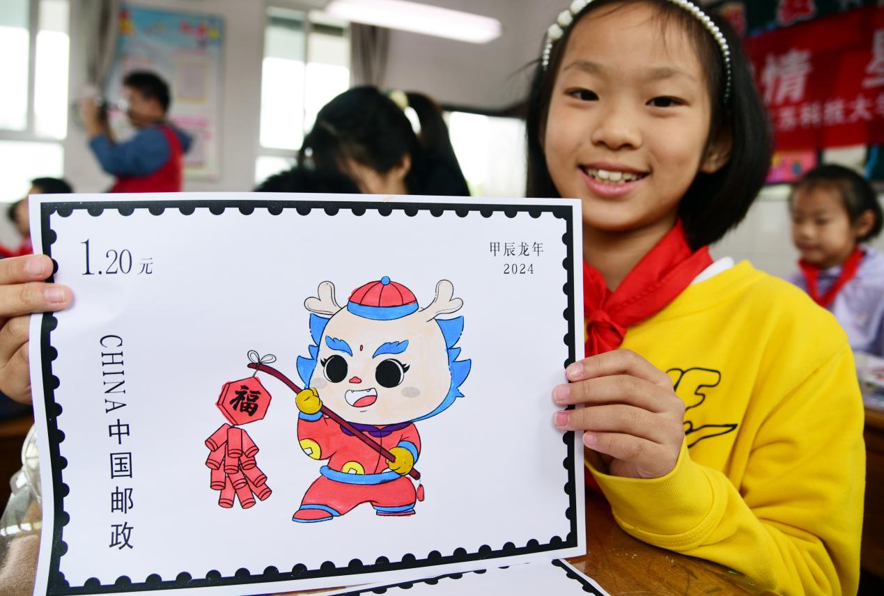 图为小朋友展示自己绘制的邮票 石玉成 摄