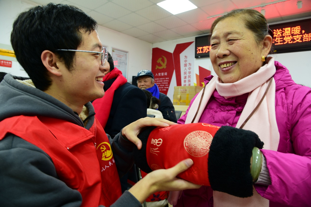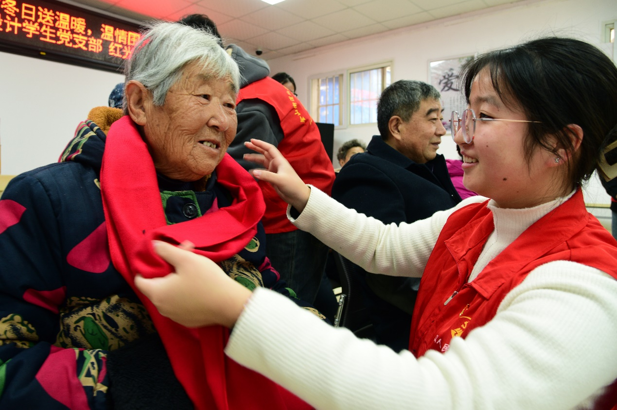 12月6日上午9:00,工业设计学生党员志愿者在社区干部的引导下,胸前佩戴“党徽”,身穿“红色马甲”,给每位到来的老人分发围巾和暖手袋,同时用温暖话语带去关怀与温情。一条条精致的围巾围在老人脖颈上,希望他们在这个寒冷的冬季,带上志愿者们那份火热的心意和祝福,迎接新的一年。除了送去保暖用品之外,党员志愿者们也与老人们交流谈心,详细地询问身体和家庭情况,并叮嘱他们适时添衣加被,注意防寒。“谢谢,真的谢谢你们!我感受到了党组织对我们普通百姓的关心与问候,这保暖物资里面蕴含了十分浓厚的关怀,让我心里倍感温暖、亲切!”现场的一位老人激动地对志愿者说道。看着老人们脸上洋溢的笑容,学生党员们纷纷表示今后将继续弘扬党的光荣传统和优良作风,践行党的初心使命、根本宗旨,关心关注涉及人民群众切身利益的问题,用心用情解决百姓的困难事。
