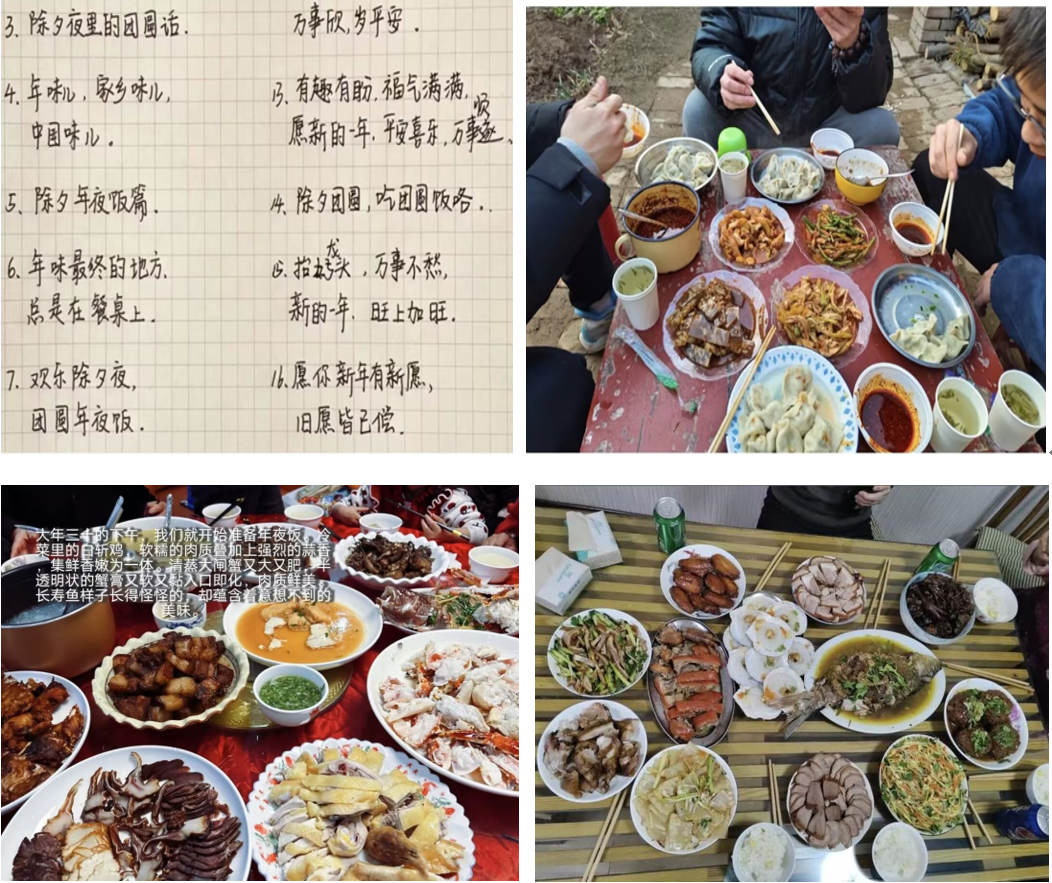 爆竹声中一岁除,春风送暖入屠苏。千门万户曈曈日,总把新桃换旧符。本次活动分为两种参与形式,第一种为上传年夜饭的照片或者视频,并且附有文字介绍。本项活动旨在记录每个家庭团圆瞬间,同时让同学们参与到团圆饭制作的契机。千家万户的团圆饭照片,不仅仅是一家人团圆的记录,更是中国人民生活越来越好的真实写照。