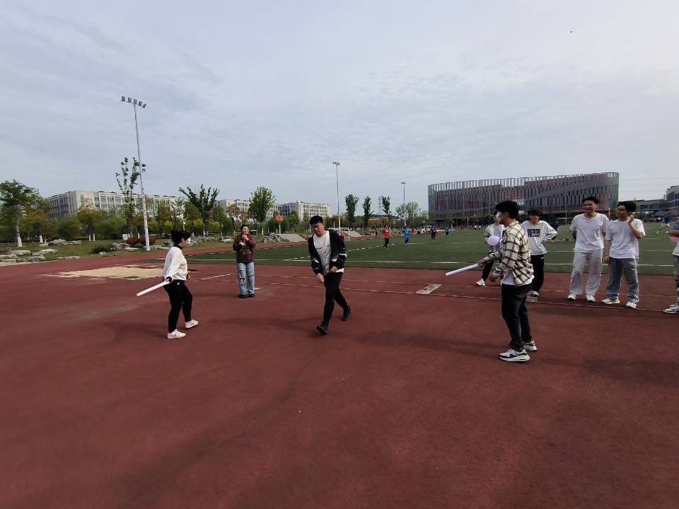 “最终煎熬”则是两组各派出一位同学戴上眼罩,剩下来各组内各一名代表一条腿上绑上铃铛,在规定区域内跑动,防止被带眼罩的同学的海绵棒扫到,每一步都充满了挑战与乐趣。游戏现场激烈有趣,同学们热情似火,在玩游戏比赛的同时也锻炼了身体。