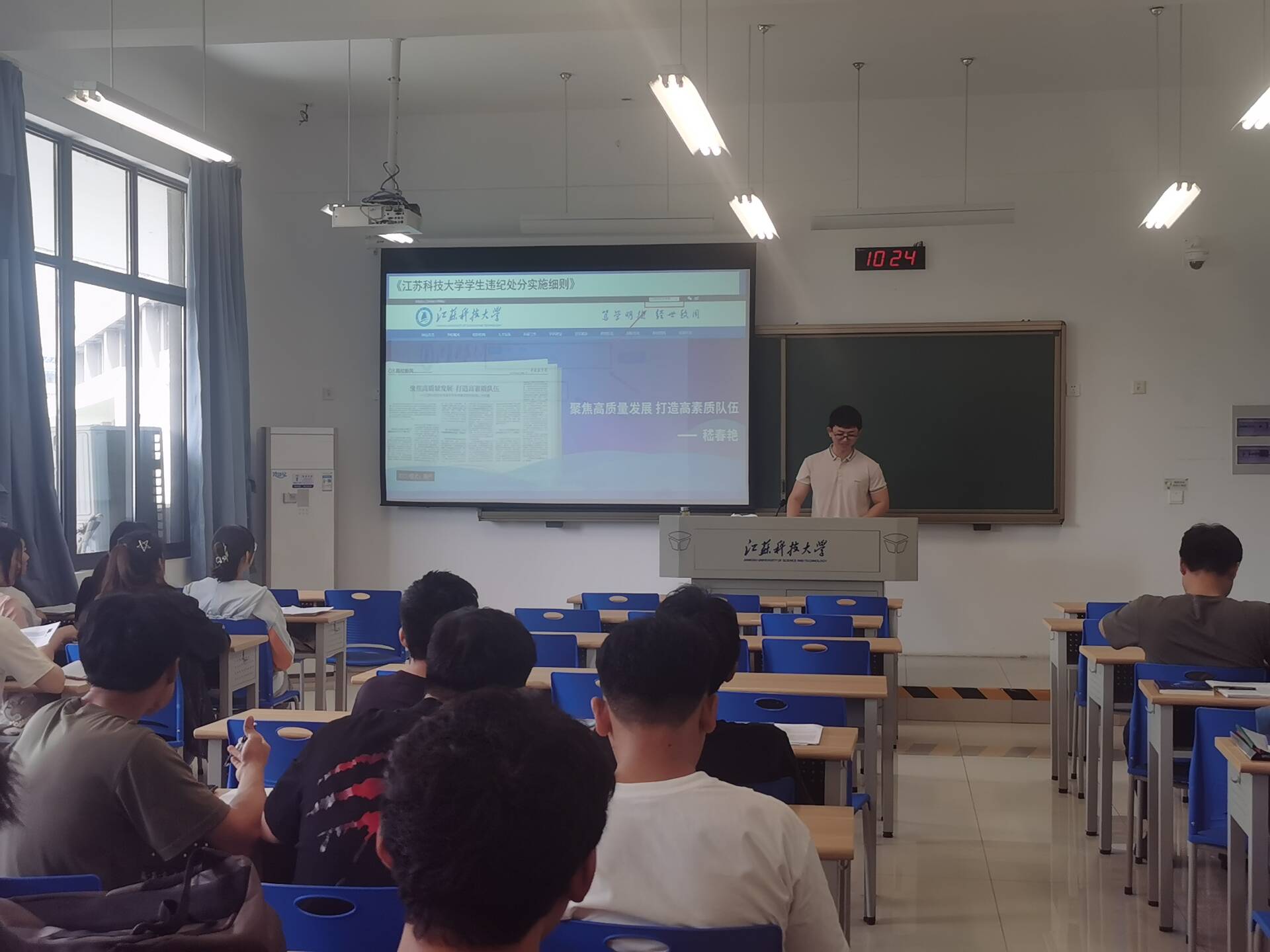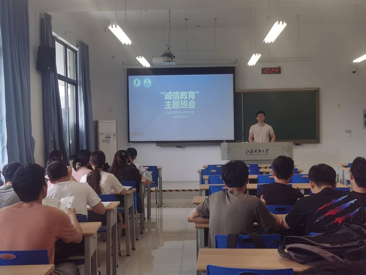 在会上,辅导员李南南首先对于诚信考试的必要性以及主题班会开展的重要性作出解释,现场带领同学们一起学习《江苏科技大学学生违纪处分实施细则》,就有关考试的规定给同学们做了讲解,对同学们易犯的一些错误做了分析,重点强调了关于作弊处罚等有关事项。随后向同学提出了携带“三证”参加考试的要求,加强了同学对于此事的印象。最后,鼓励同学们在接下来的一段时间内好好学习,不要对考试抱有侥幸,争取在四六级考试和期末考试中取得优异的成绩。在会后各班班长组织同学一起签订了《江苏科技大学学生诚信考试承诺书》,更加明确了诚信考试的各种要求,更好地鼓励同学们要树立诚信,诚实做人的良好作风。
