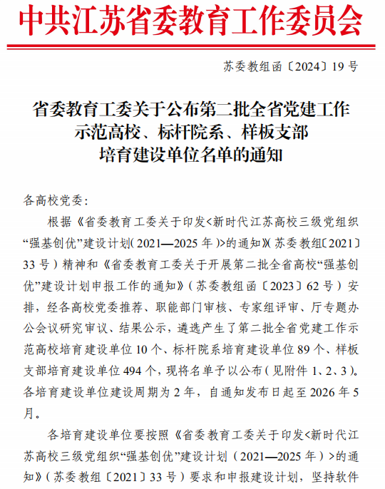 近日,江苏省委教育工委公布了第二批全省高校党建工作“标杆院系”“样板支部”培育创建单位名单,牛彩网 党委批省高校党建工作“标杆院系”培育创建单位。