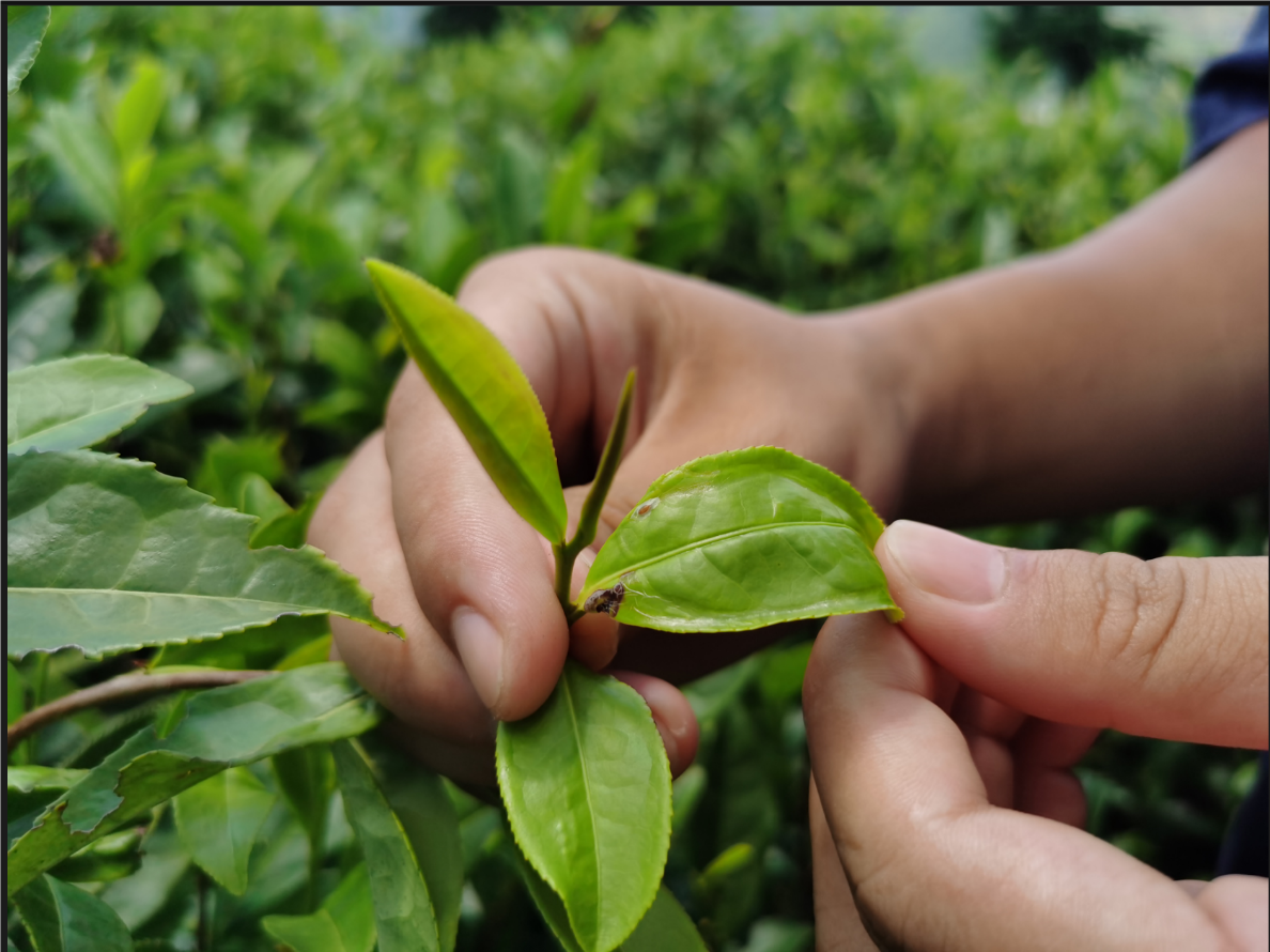 实践团成员向当地茶农请教茶叶采摘技巧,投入到茶叶的采摘工作中。一步一动,采茶的道路上充满着收获的喜悦,一携一取,装茶的框里洋溢着对生活的期许。实践团成员躬亲力行,在山间助力茶叶采摘,帮助茶农完成采茶工作。