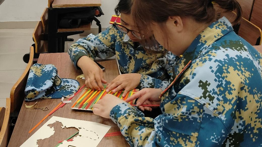 活动伊始,志愿者通过PPT讲解竹编历史文化。志愿者充满激情地向大家详细介绍竹编的悠久历史,大家纷纷表示领略到竹编艺术的深厚底蕴。接着,志愿者们展示了各种竹编的技艺手法,复杂而精妙的编织作品吸引了同学们的兴趣,也为同学们对于竹编创作充满了期待与热情。在编竹环节,他们或专注地在纸上勾勒出竹子的挺拔姿态,或精心地挑选竹条进行编织,每一个动作都饱含着对艺术的热爱和对国庆的美好祝福。同学们充分发挥自己的想象力和创造力,编绘出形态各异、富有神韵的竹子画作。有的展现出对教官的深深的感恩,有的则表达出对生活的热爱和对祖国繁荣的赞颂。同学们在志愿者的指导下,学习各种编织技巧,绘制了一件件精美的画作,每一件作品都凝聚着同学们的心血和智慧。