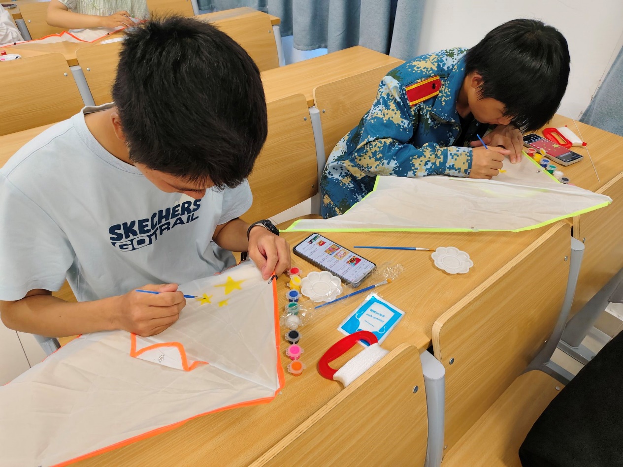 手绘风筝,放飞梦想,共庆国庆华章。结束了漆扇的制作,更多的同学们投入到了风筝的制作中。他们在空白的风筝上尽情挥洒创意,有的选择传统图案,如红旗、长城,寓意祖国繁荣昌盛;有的则结合现代元素,创作出富有时代感的风筝。在制作过程中,同学们相互协作,共同解决制作中遇到的问题,不仅锻炼了动手能力和团队合作精神,还增进了同学间的友情,同时也激发了同学们的爱国热情和民族自豪感,让他们更加珍惜现在的幸福生活。