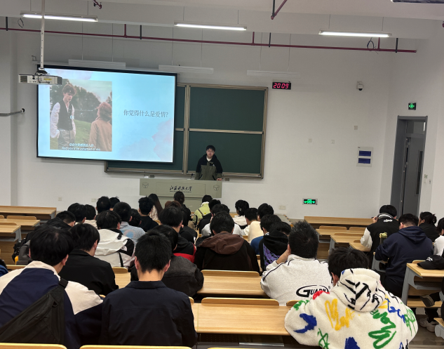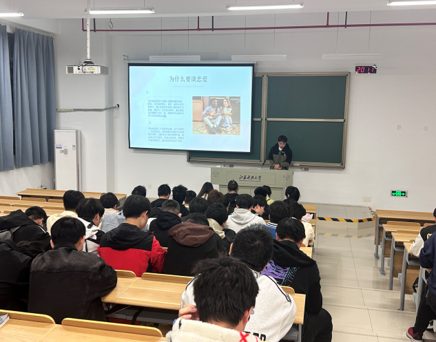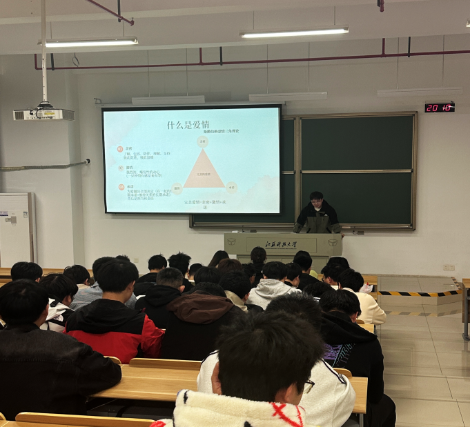 活动现场,两个班级无人缺席,同学们的脸上洋溢着青春的气息,眼中透露出对此次班会主题的好奇与期待。从经典文学作品中的爱情故事,到心理学家对爱情的科学分析,再到历史人物的爱情传奇,主讲人陈安万通过理论讲解和案例分析的形式和同学们进行了积极分享。