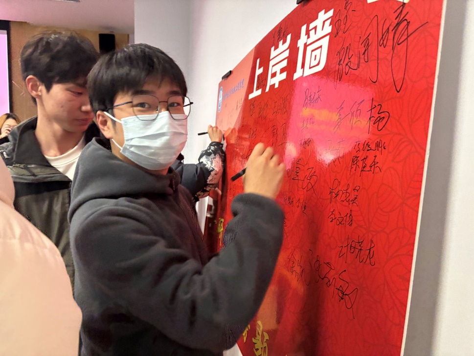 活动伊始,每位考研学子在入场处的“上岸墙”上签名,寓意着“一研为定,金榜题名”。