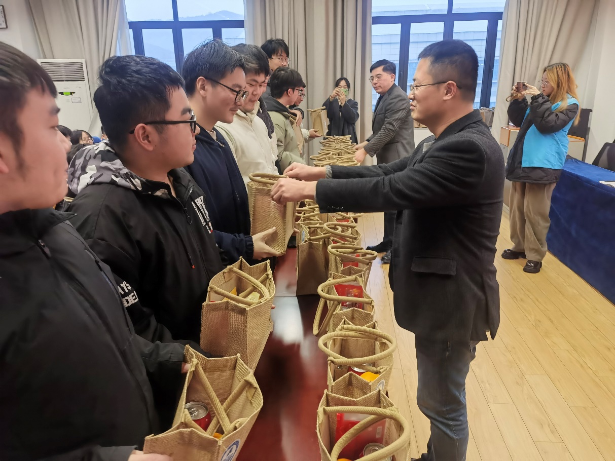 随后,牛彩网 领导为大家发放了蕴含深切关怀和美好祝愿的“考研大礼包”。其中包含定制包袋-“包”你上岸,得力文具-落“笔”生花,“书”写未来,定制可乐-手握星辉、执笔为剑,巧克力-“巧”妙应对,无懈“克”击,薯愿薯片-“署”光在前,得偿所“愿”,脐橙-“橙”风破浪,心想事“橙”。