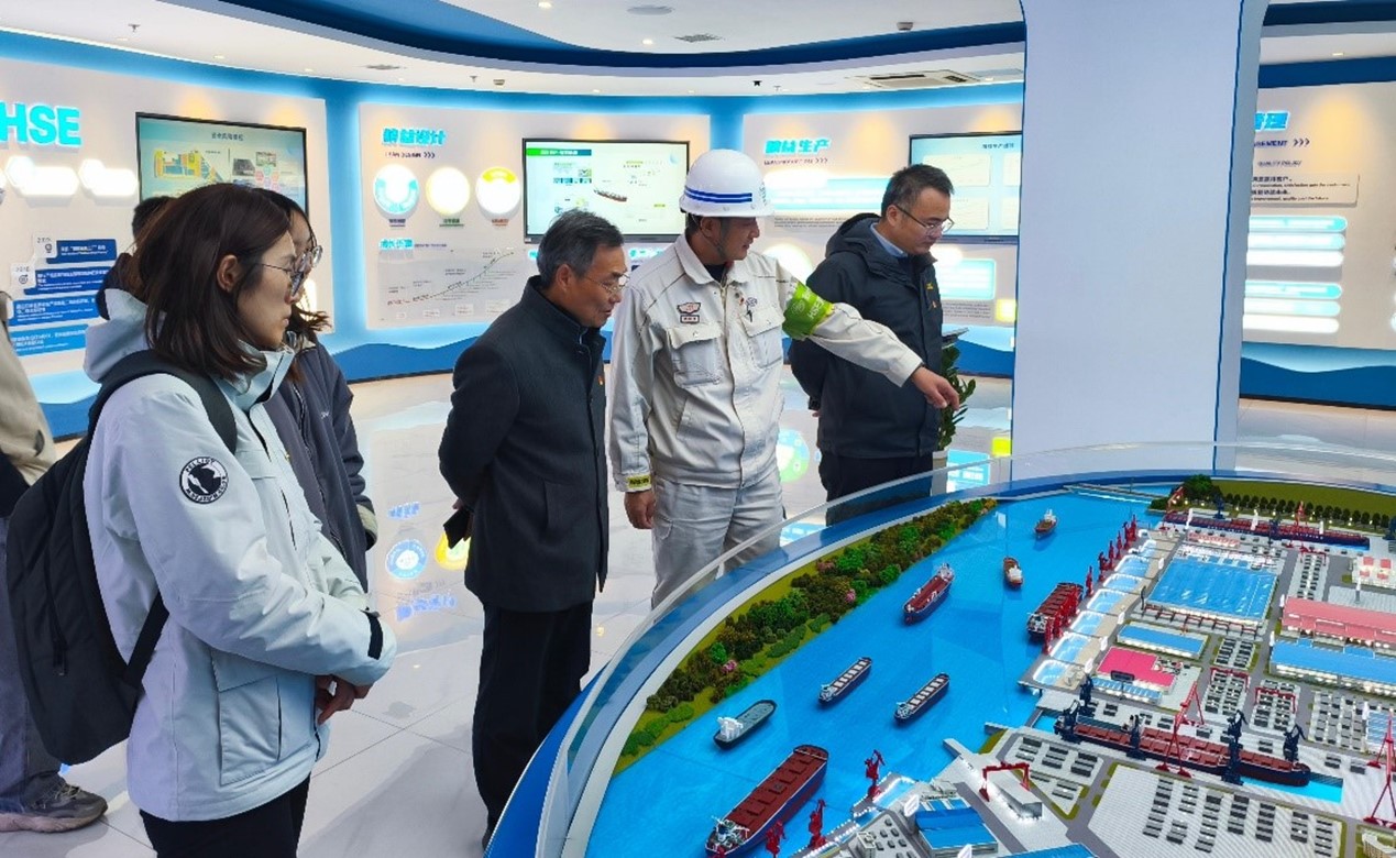 随后,扬州中远海运重工有限公司的工作人员带领全体党员参观了牛彩网馆,支部成员深入了解了企业发展历史。同时,支部师生一起参观了正在舾装的集装箱船。
