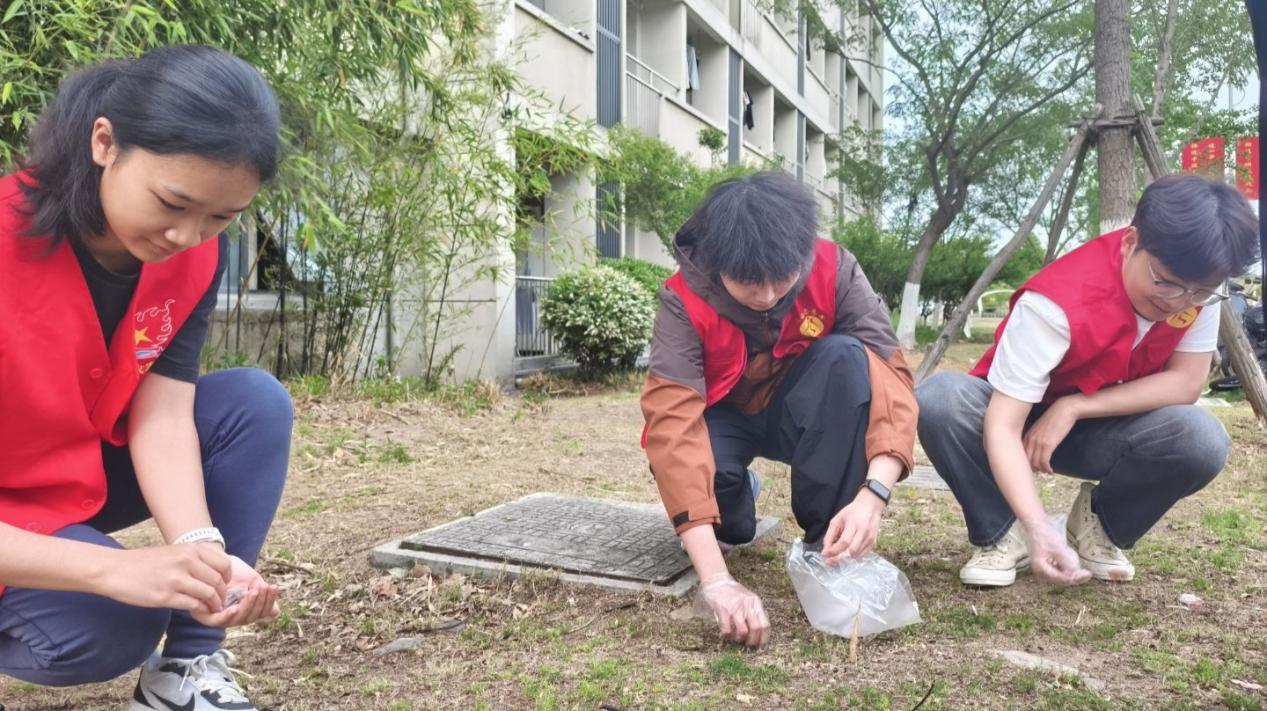 图为志愿者捡拾宿舍楼下的烟头 周航宇 摄