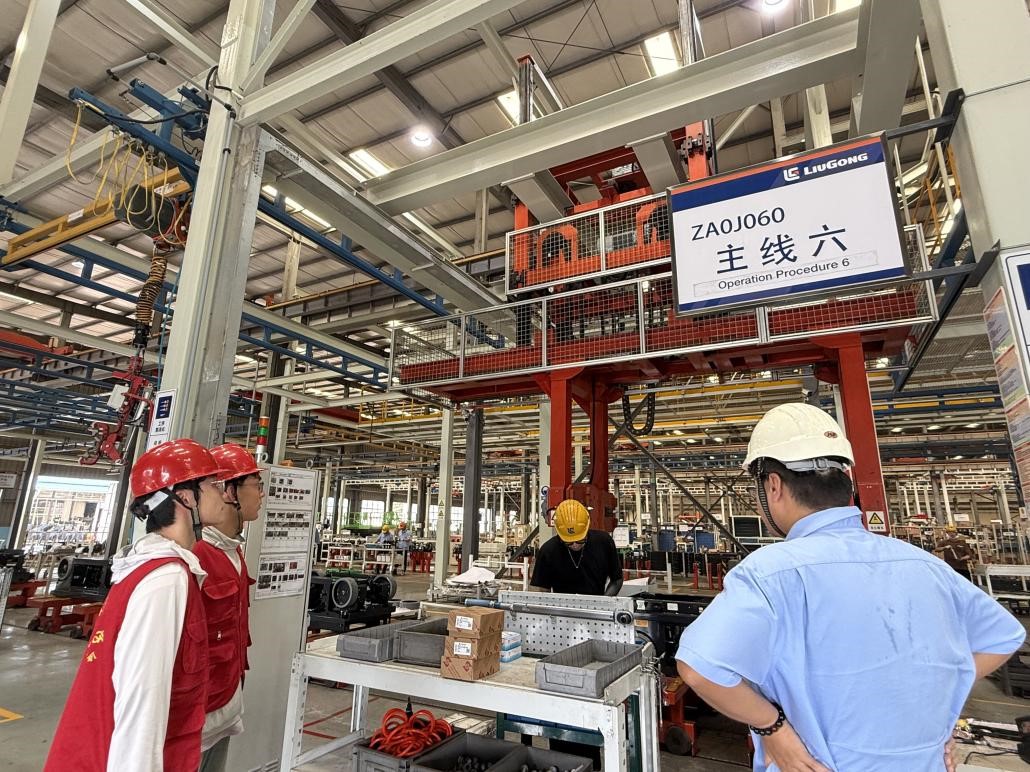 7月4日下午,实践团成员抵达江苏柳工有限公司,完成入厂登记、安全培训及防护装备穿戴(包括安全帽、防滑鞋、工装服)等流程后,正式进入厂区开展实践活动。
