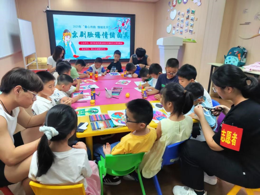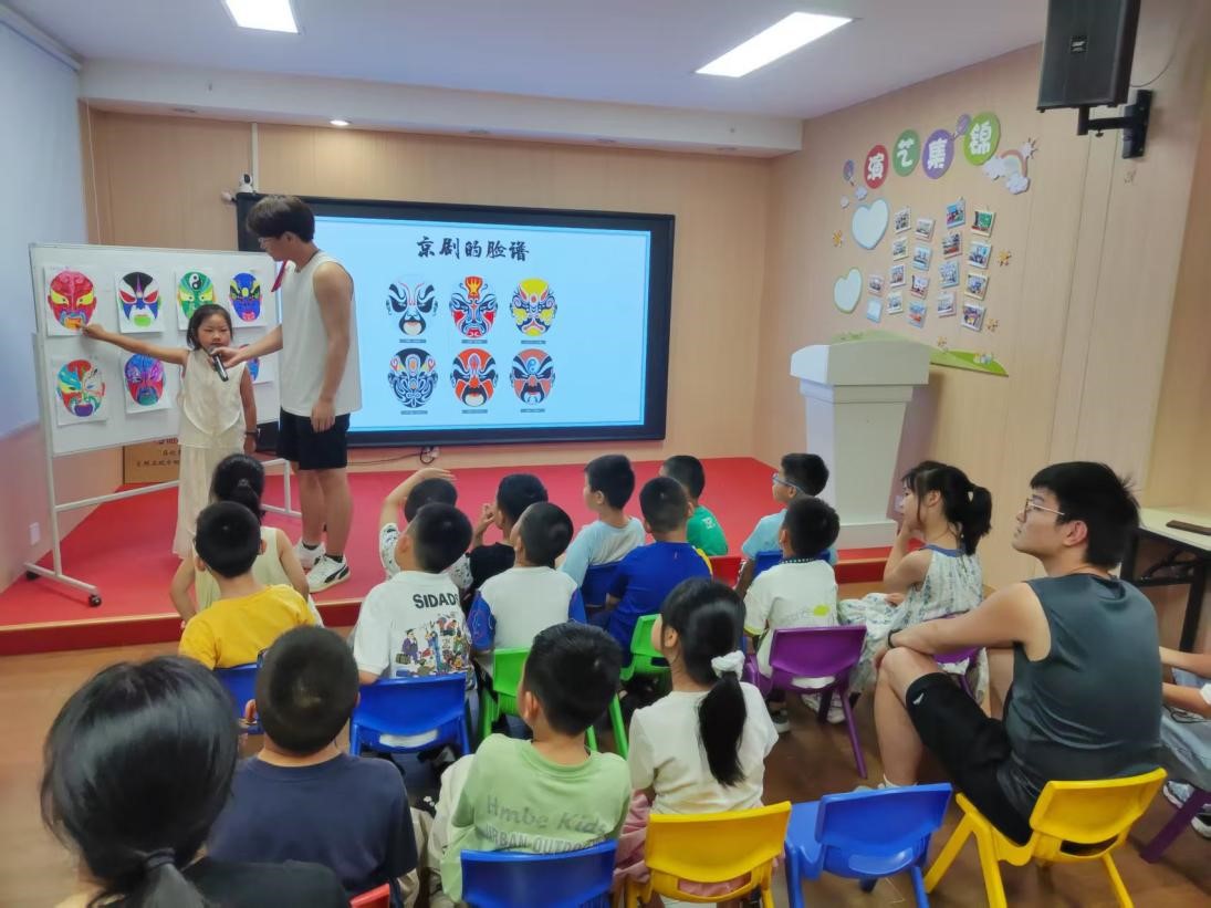 7月8日,成员们陪小朋友进行脸谱绘制活动。成员们为孩子们介绍了脸谱的相关知识,讲解了不同颜色在脸谱中代表的情绪和性格。绘画过程中,孩子们兴奋地模仿着脸谱所代表的人物神态,教室里充满了欢声笑语。