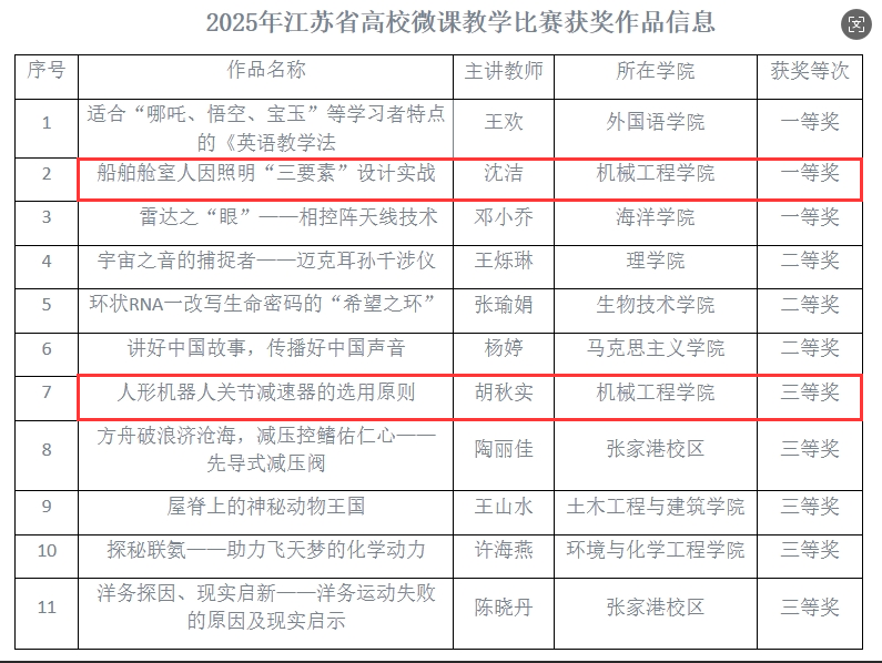 近日,江苏省高等学校教育信息化研究会公布了2025年江苏省高校微课教学比赛结果。牛彩网 参赛作品再创佳绩, 工业设计系沈洁老师斩获一等奖,机械制造工程系胡秋实老师荣获三等奖,成绩位居全校前列。