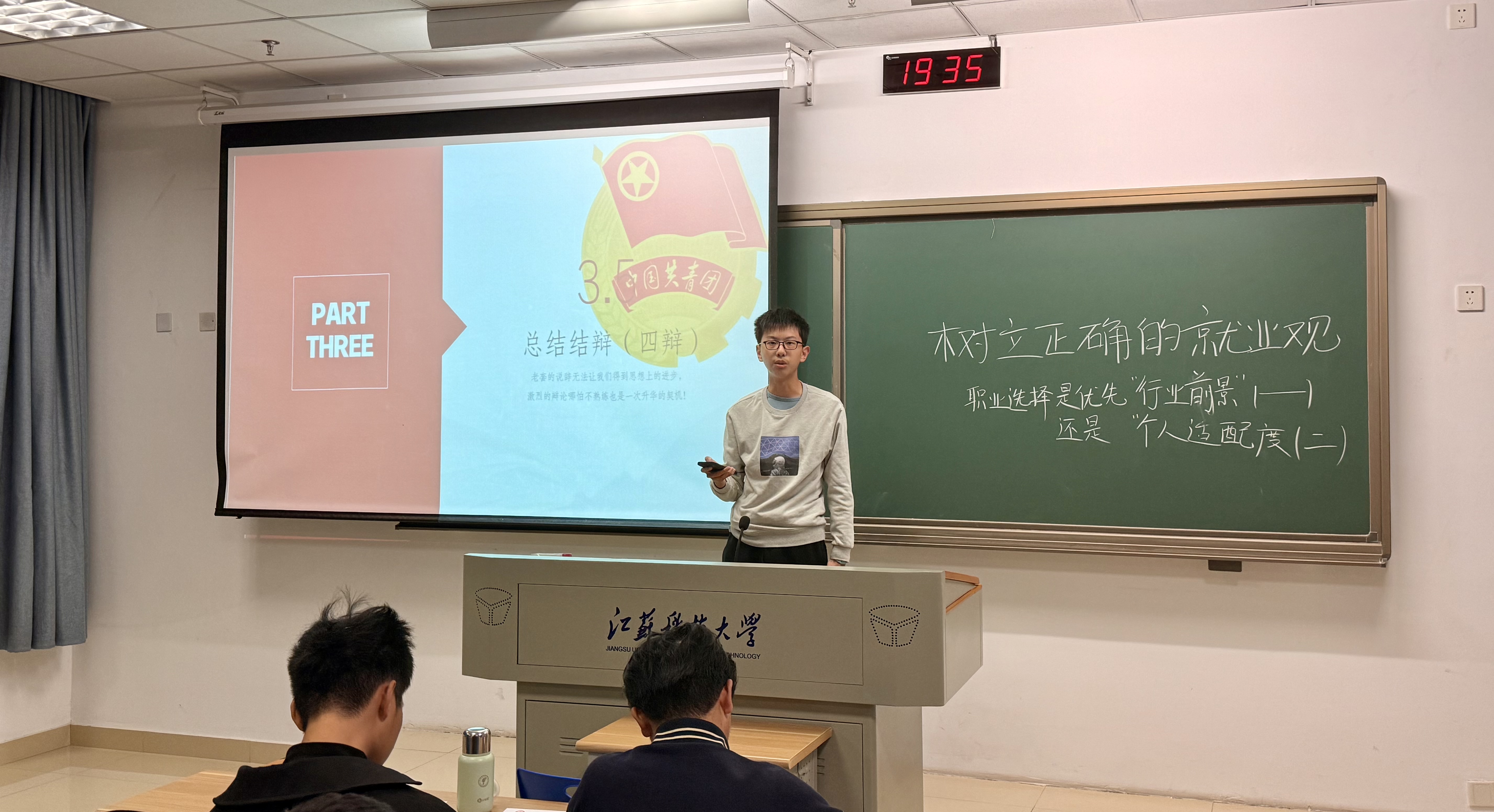 十五分钟准备时间里,同学们查阅资料、凝练观点,深化了对就业本质的理解。活动尾声,团支书徐航总结发言,指出当下就业形势复杂,唯有树立正确就业观才能锚定方向,鼓励大家跳出焦虑,主动了解行业、认识自我,在实践中校准人生坐标。