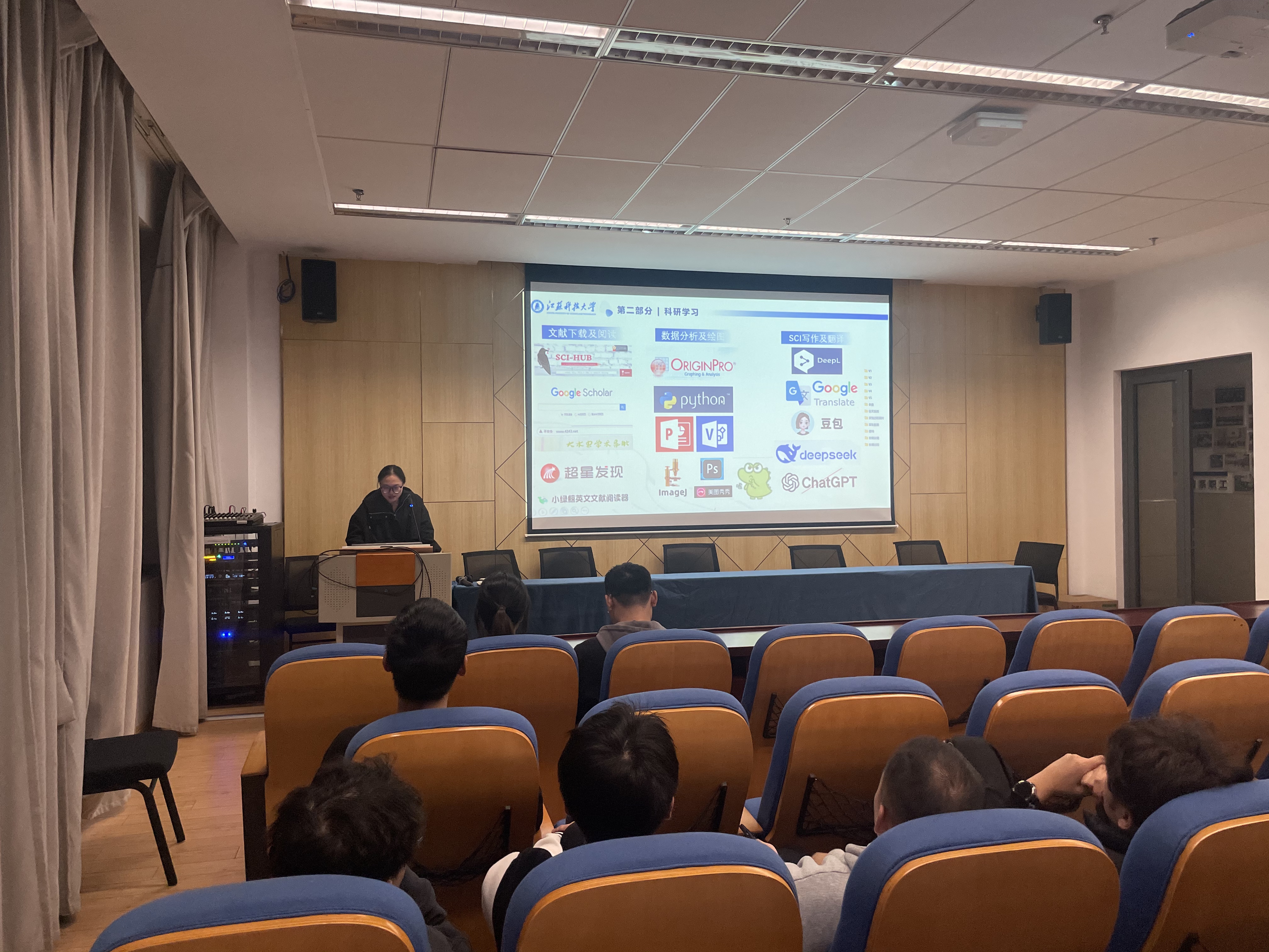 随后,庄妮从“掌握科研技巧,精进论文写作”这一方面,为新生提供了从基础能力培养到实战写作的“硬核”指导。她指出,阅读高质量外文刊物有助于深化对专业的认知并提升英语写作能力,同时推荐了一系列实用的科研工具,涵盖数据处理、文献检索与管理等方面。在论文写作环节,她详细解析了研究性论文与综述性论文的差异,并提醒新生注意避免数据堆砌、规范引用格式等常见问题。