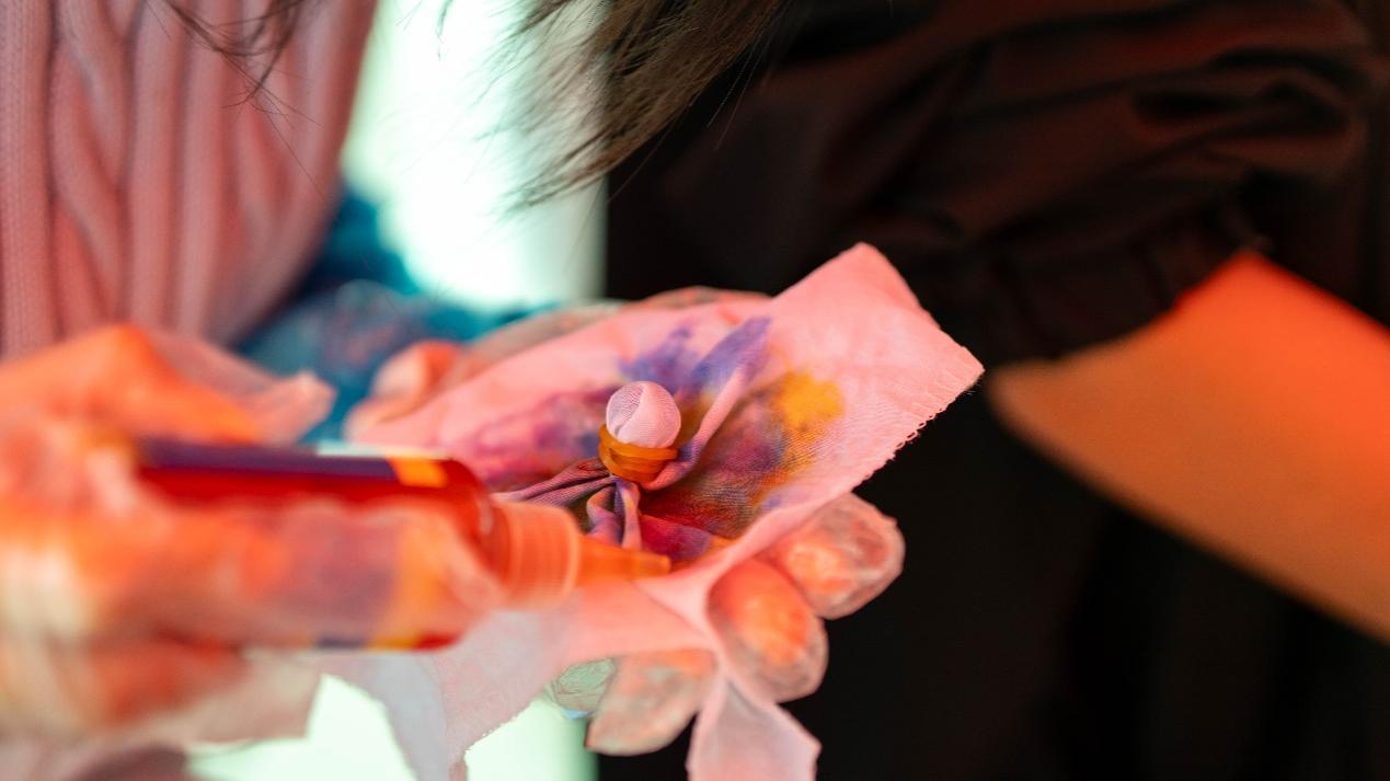 在手帕扎染体验区,同学们兴趣浓厚。在指导志愿者介绍扎染基本技法之后,大家领到纯白手帕与工具,开始发挥创意。这一过程让同学们感受非遗文化魅力,体会耐心与专注带来的喜悦。