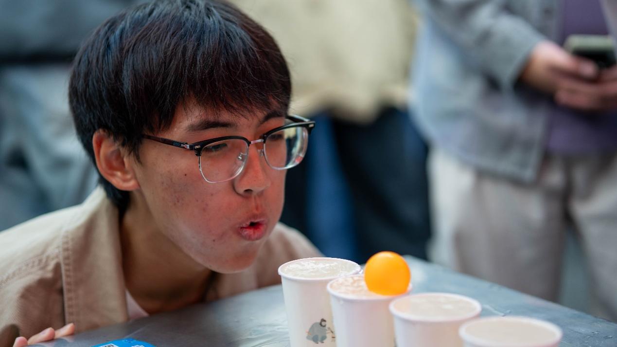 另一侧的“吹球传趣”区域充满紧张刺激的欢呼与鼓励声。参与者不用双手,仅靠嘴吹气,把乒乓球从第一个杯子依次传到最后一个杯子。此任务看似简单,实则妙趣横生,既是肺活量的较量,也是技巧的考验。
