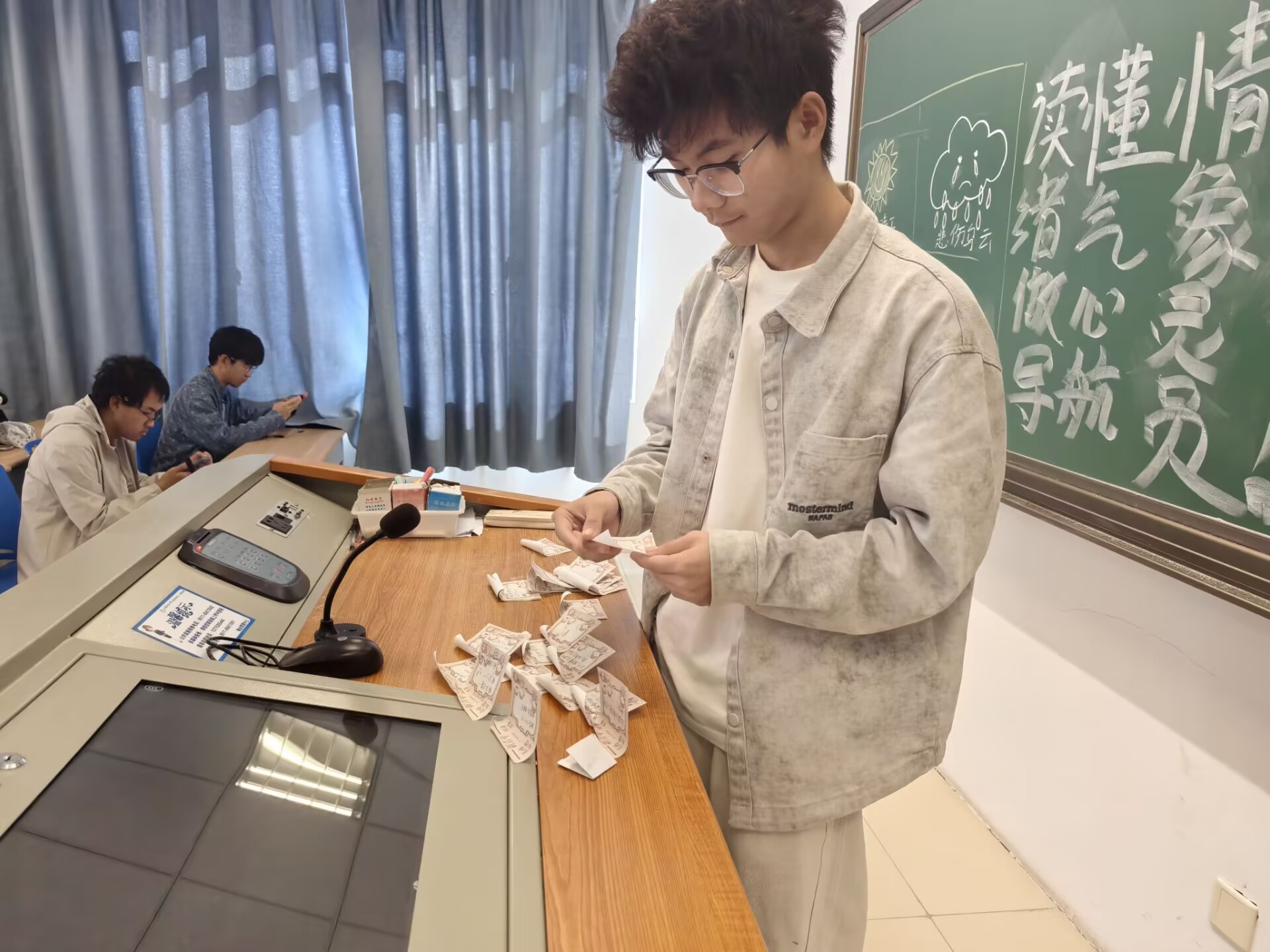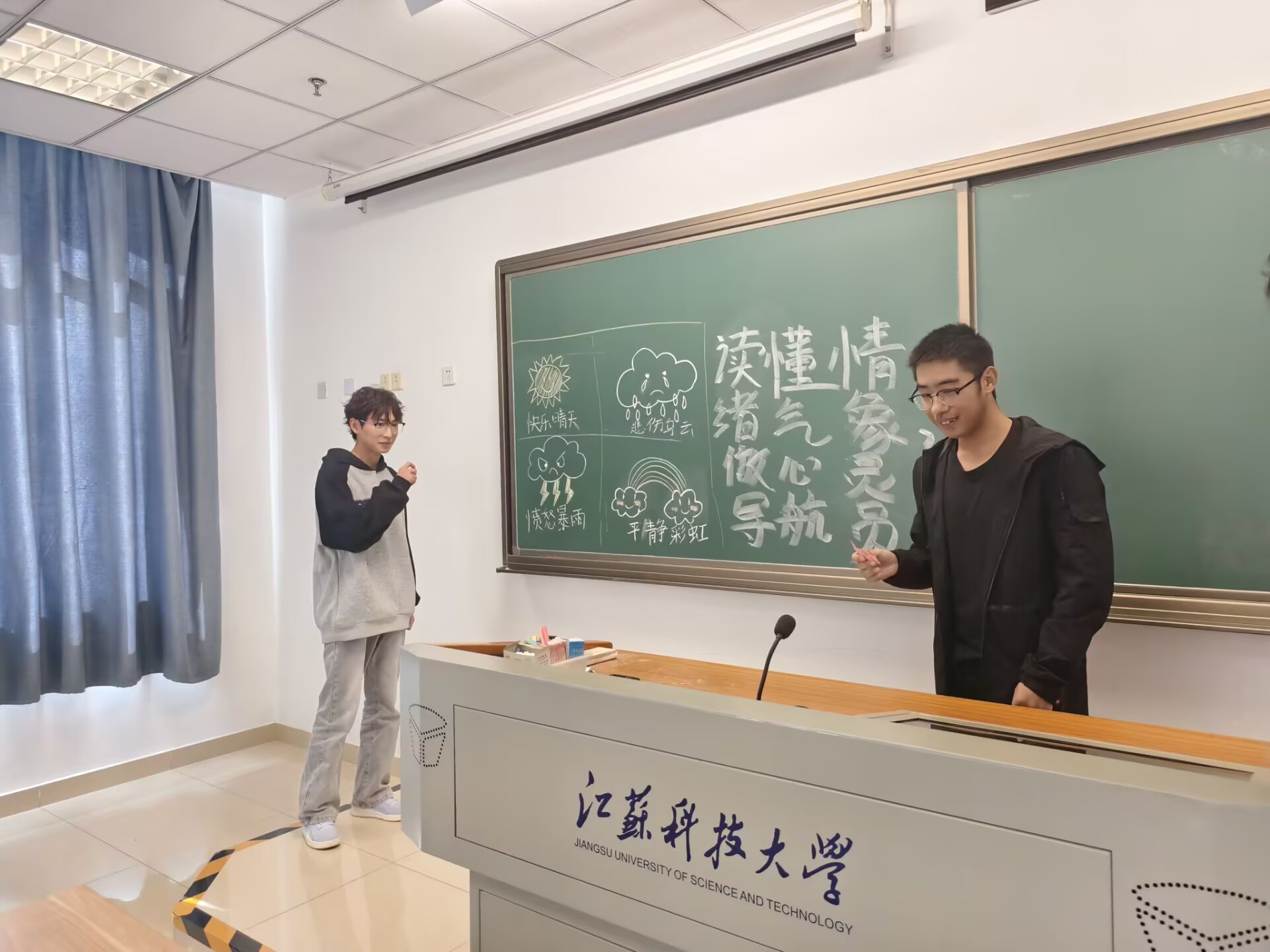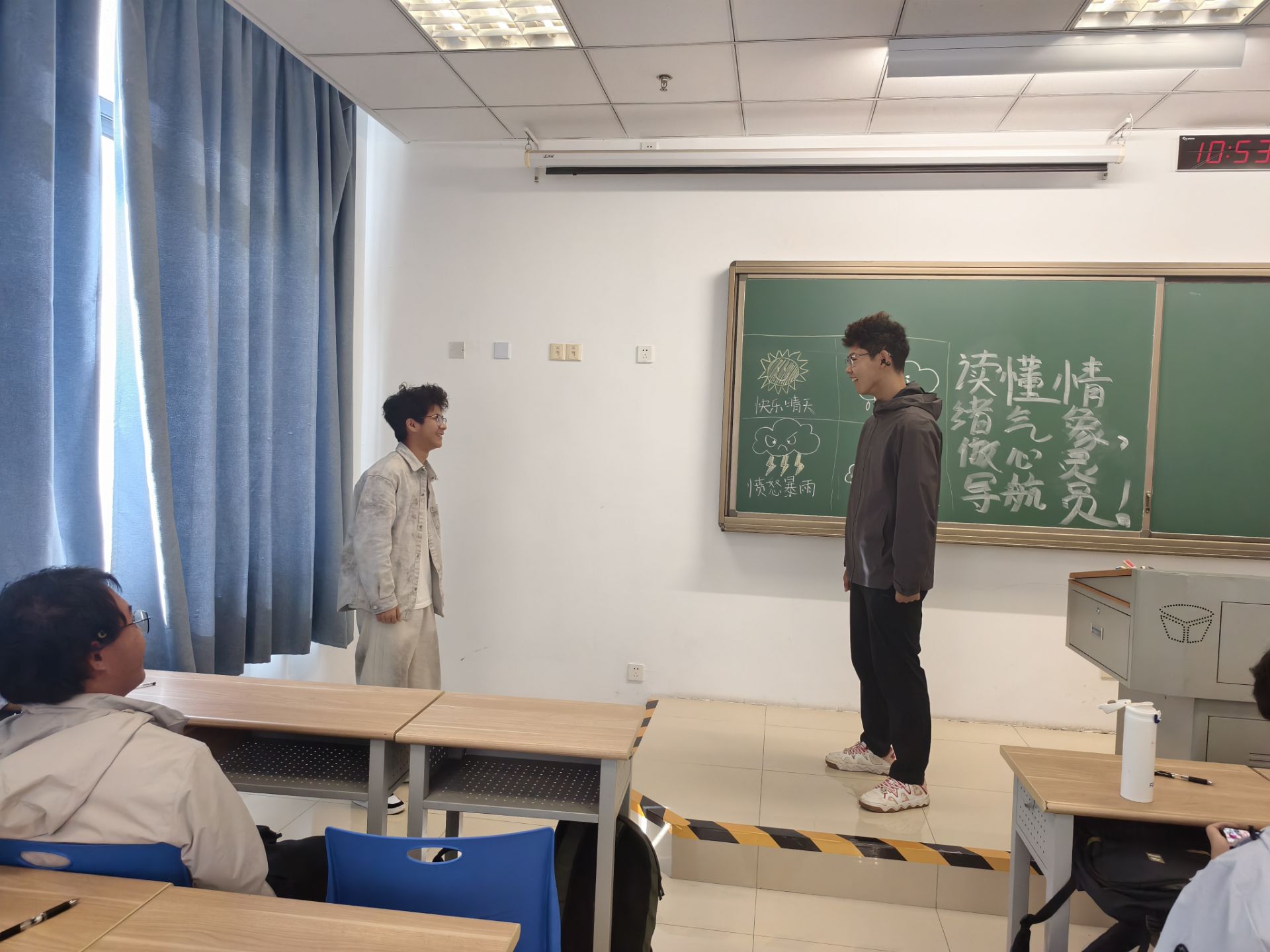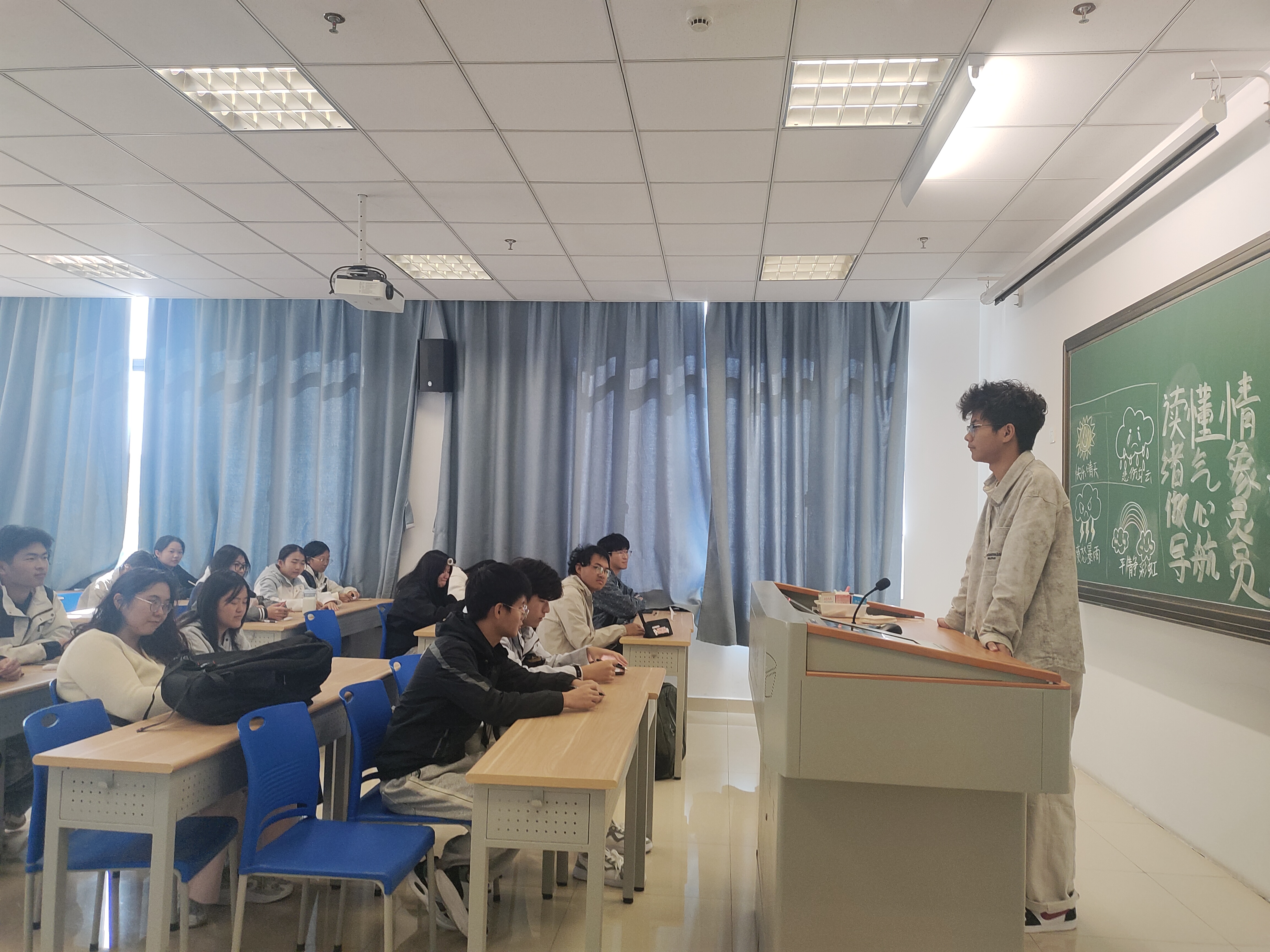 情绪像天气,雨后有彩虹。10月24日工业设计1班在文理大楼307开展“读懂情绪气象,做心灵导航员”的心理活动主题班会,一张布满天气符号的“情绪气象台”图画正无声讲述着青春期心灵的晴雨变迁。没有枯燥说教,通过文字抒发、表演释放让00后青少年学会与自我和解。