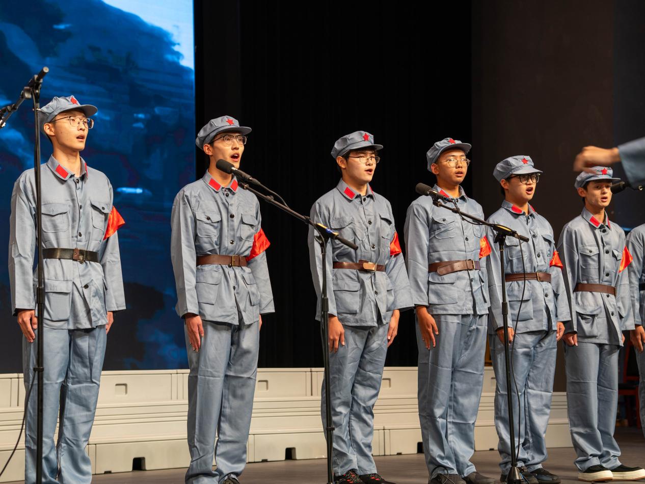 《爱永在》则以温暖曲风传递家国大爱。百余位学子身着统一服装,歌声嘹亮、姿态昂扬,从低声铺垫到高声迸发,层次丰富、感染力强,既展现团队凝聚力,也诠释新时代青年对“爱”的理解。