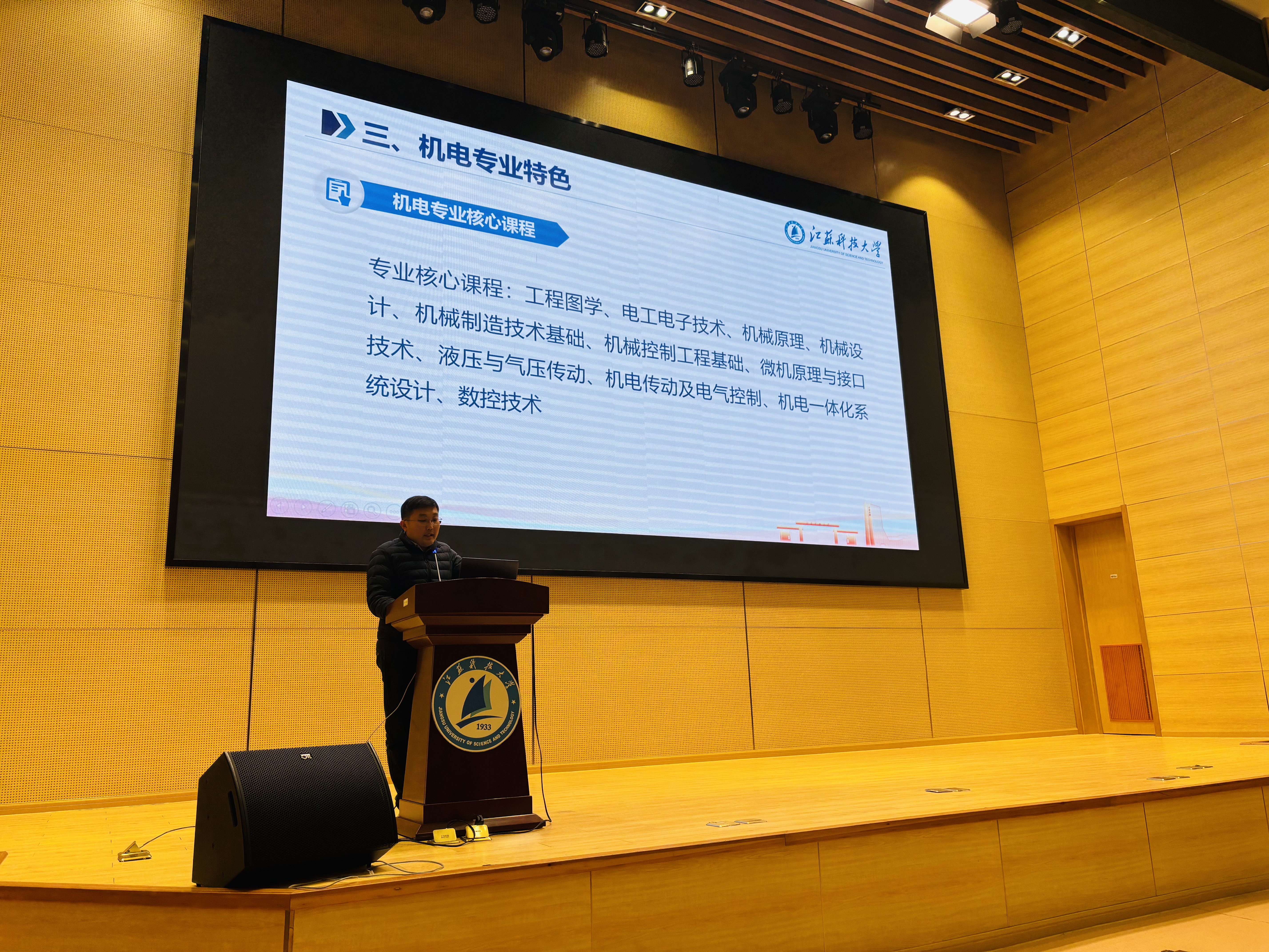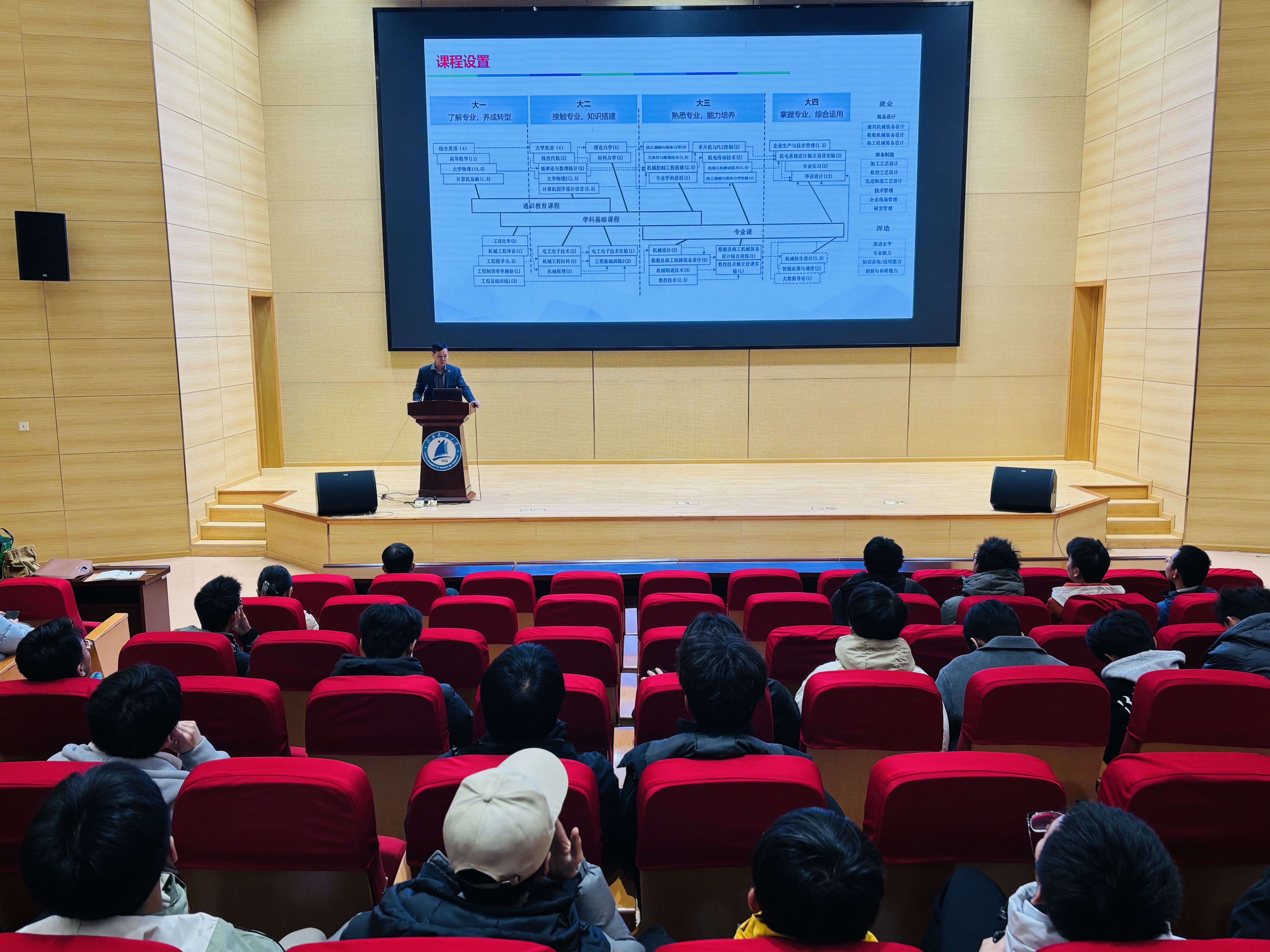 紧接着,机械电子工程专业负责人李冲老师登台,为新生们带来专业分享。他以专业基本概况、机电专业优势、机电专业特色及学生培养路径四大板块为脉络展开介绍,重点聚焦本专业雄厚的师资储备、往届优秀毕业生的发展轨迹,以及船海方向的前沿科研成果。详实的案例与鲜明的专业特色相结合,让在座新生对机械电子工程专业有了清晰而直观的认识。