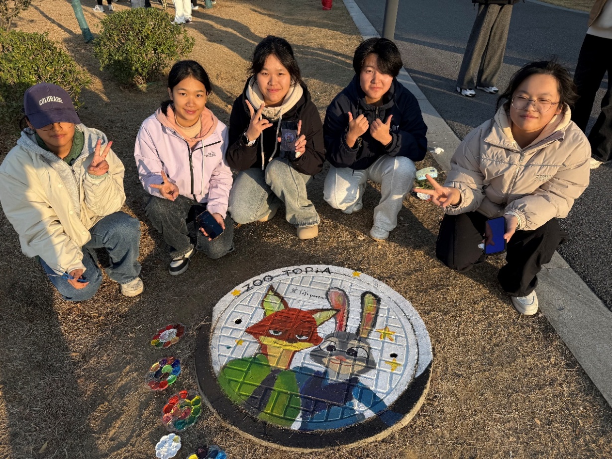经过两个小时的精心绘制,几个井盖焕然一新。原本毫不起眼的校园角落,瞬间变成了一个小型露天画廊。每一幅作品都凝结着同学们的用心与创意,让平凡的路面空间焕发出生机与趣味,真正实现了“行走间的小惊喜”。