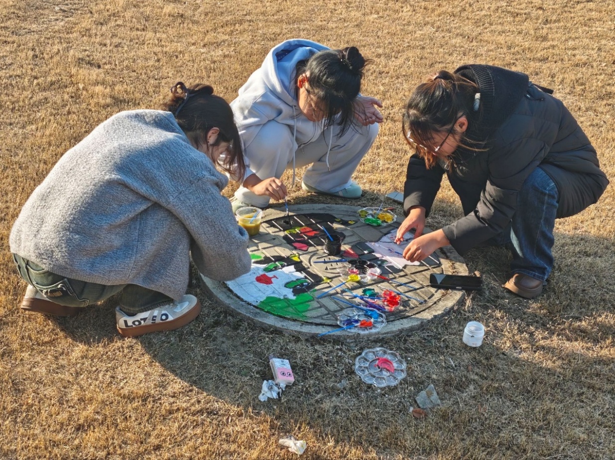 随着颜料铺开,同学们全情投入创作。有人绘制出萌萌的卡通形象,为校园增添一抹治愈,还有人发挥天马行空的想象,创作出抽象图案或励志标语。大家专注的神情与井盖上逐渐浮现的鲜活画面,构成了一道动人的风景线。一笔一画间,灰暗的井盖逐渐“活”了起来,成为承载学子巧思的独特画布。