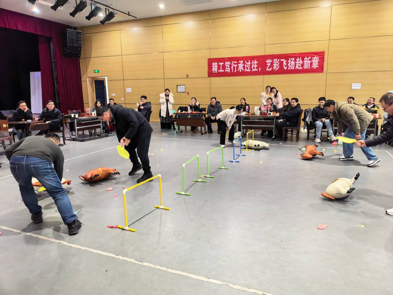 在互动环节,“踩气球大战”游戏紧张刺激、妙趣横生,现场欢呼声、加油声、气球的爆裂声此起彼伏。随后进行的经典游戏“抢凳子”则考验着老师们的反应速度与敏捷度。“心有灵犀——你画我猜”游戏中,各系部搭档配合默契,比划者形象生动、猜词者脑洞大开,不时出现的“神解读”引发阵阵爆笑,充分展现了同事间的了解与默契。随后的“策马扬鞭”游戏则别出心裁,老师们用扇子作为“马鞭”,小心翼翼地将充气小马“驱赶”向目标,比拼的不仅是巧劲,更是耐心与技巧,喝彩不断。